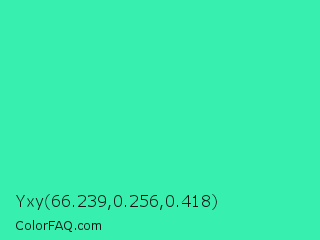 Yxy 66.239,0.256,0.418 Color is a normal green color and the nearest color is Eucalyptus #44d7a8. Hex code #37f0b0 and RGB value is rgb(55,240,176). In RGB color space, this color is composed of 22% red, 94% green, 69% blue, In CMYK color space, this color is composed of 77% cyan, 0% magenta, 27% yellow , 6% black , In HSL color space, this color has a hue angle of 159° , 86% saturation and 58% lightness.