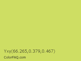 Yxy 66.265,0.379,0.467 Color is a light yellow color and the nearest color is Booger Buster #dde26a. Hex code #cede63 and RGB value is rgb(206,222,99). In RGB color space, this color is composed of 81% red, 87% green, 39% blue, In CMYK color space, this color is composed of 7% cyan, 0% magenta, 55% yellow , 13% black , In HSL color space, this color has a hue angle of 68° , 65% saturation and 63% lightness.