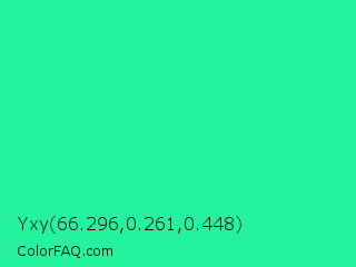 Yxy 66.296,0.261,0.448 Color is a normal green color and the nearest color is Medium Spring Green #00fa9a. Hex code #24f29e and RGB value is rgb(36,242,158). In RGB color space, this color is composed of 14% red, 95% green, 62% blue, In CMYK color space, this color is composed of 85% cyan, 0% magenta, 35% yellow , 5% black , In HSL color space, this color has a hue angle of 156° , 89% saturation and 55% lightness.