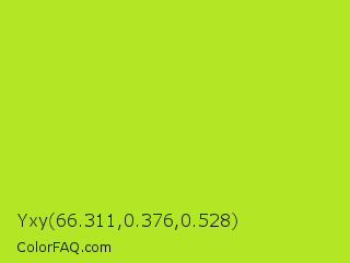 Yxy 66.311,0.376,0.528 Color is a normal lime color and the nearest color is Inch Worm #b0e313. Hex code #b3e625 and RGB value is rgb(179,230,37). In RGB color space, this color is composed of 70% red, 90% green, 15% blue, In CMYK color space, this color is composed of 22% cyan, 0% magenta, 84% yellow , 10% black , In HSL color space, this color has a hue angle of 76° , 79% saturation and 52% lightness.