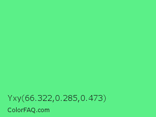 Yxy 66.322,0.285,0.473 Color is a light green color and the nearest color is Very Light Malachite Green #64e986. Hex code #5cf088 and RGB value is rgb(92,240,136). In RGB color space, this color is composed of 36% red, 94% green, 53% blue, In CMYK color space, this color is composed of 62% cyan, 0% magenta, 43% yellow , 6% black , In HSL color space, this color has a hue angle of 138° , 83% saturation and 65% lightness.