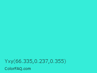 Yxy 66.335,0.237,0.355 Color is a normal cyan color and the nearest color is Turquoise #40e0d0. Hex code #35edd9 and RGB value is rgb(53,237,217). In RGB color space, this color is composed of 21% red, 93% green, 85% blue, In CMYK color space, this color is composed of 78% cyan, 0% magenta, 8% yellow , 7% black , In HSL color space, this color has a hue angle of 173° , 84% saturation and 57% lightness.