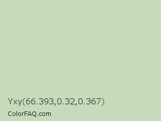 Yxy 66.393,0.32,0.367 Color is a light green color and the nearest color is Pixie Green #c0d8b6. Hex code #c7dbbb and RGB value is rgb(199,219,187). In RGB color space, this color is composed of 78% red, 86% green, 73% blue, In CMYK color space, this color is composed of 9% cyan, 0% magenta, 15% yellow , 14% black , In HSL color space, this color has a hue angle of 98° , 31% saturation and 80% lightness.