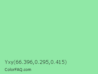 Yxy 66.396,0.295,0.415 Color is a light green color and the nearest color is Teal Deer #99e6b3. Hex code #90e8a6 and RGB value is rgb(144,232,166). In RGB color space, this color is composed of 56% red, 91% green, 65% blue, In CMYK color space, this color is composed of 38% cyan, 0% magenta, 28% yellow , 9% black , In HSL color space, this color has a hue angle of 135° , 66% saturation and 74% lightness.