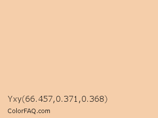 Yxy 66.457,0.371,0.368 Color is a very light orange color and the nearest color is Pancho #edcdab. Hex code #f5ceaa and RGB value is rgb(245,206,170). In RGB color space, this color is composed of 96% red, 81% green, 67% blue, In CMYK color space, this color is composed of 0% cyan, 16% magenta, 31% yellow , 4% black , In HSL color space, this color has a hue angle of 29° , 79% saturation and 81% lightness.