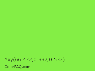Yxy 66.472,0.332,0.537 Color is a normal green color and the nearest color is Kiwi #8ee53f. Hex code #84ee45 and RGB value is rgb(132,238,69). In RGB color space, this color is composed of 52% red, 93% green, 27% blue, In CMYK color space, this color is composed of 45% cyan, 0% magenta, 71% yellow , 7% black , In HSL color space, this color has a hue angle of 98° , 83% saturation and 60% lightness.