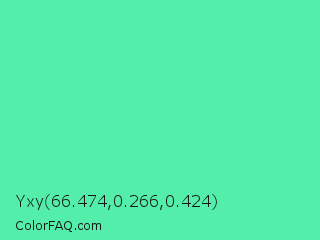 Yxy 66.474,0.266,0.424 Color is a light green color and the nearest color is Medium Aquamarine #66ddaa. Hex code #53efaa and RGB value is rgb(83,239,170). In RGB color space, this color is composed of 33% red, 94% green, 67% blue, In CMYK color space, this color is composed of 65% cyan, 0% magenta, 29% yellow , 6% black , In HSL color space, this color has a hue angle of 153° , 83% saturation and 63% lightness.