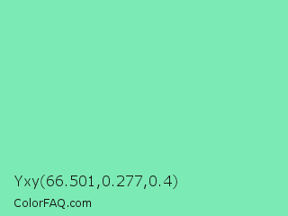 Yxy 66.501,0.277,0.4 Color is a light green color and the nearest color is Pearl Aqua #88d8c0. Hex code #7ceab4 and RGB value is rgb(124,234,180). In RGB color space, this color is composed of 49% red, 92% green, 71% blue, In CMYK color space, this color is composed of 47% cyan, 0% magenta, 23% yellow , 8% black , In HSL color space, this color has a hue angle of 151° , 72% saturation and 70% lightness.