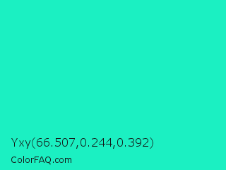 Yxy 66.507,0.244,0.392 Color is a normal cyan color and the nearest color is Turquoise PWG #30d5c8. Hex code #1bf0c2 and RGB value is rgb(27,240,194). In RGB color space, this color is composed of 11% red, 94% green, 76% blue, In CMYK color space, this color is composed of 89% cyan, 0% magenta, 19% yellow , 6% black , In HSL color space, this color has a hue angle of 167° , 88% saturation and 52% lightness.