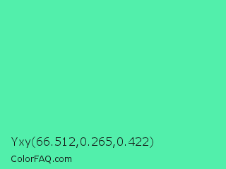 Yxy 66.512,0.265,0.422 Color is a light green color and the nearest color is Medium Aquamarine #66ddaa. Hex code #52efab and RGB value is rgb(82,239,171). In RGB color space, this color is composed of 32% red, 94% green, 67% blue, In CMYK color space, this color is composed of 66% cyan, 0% magenta, 28% yellow , 6% black , In HSL color space, this color has a hue angle of 154° , 83% saturation and 63% lightness.