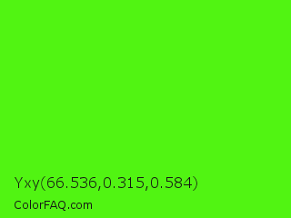 Yxy 66.536,0.315,0.584 Color is a normal green color and the nearest color is Chlorophyll Green #4aff00. Hex code #51f412 and RGB value is rgb(81,244,18). In RGB color space, this color is composed of 32% red, 96% green, 7% blue, In CMYK color space, this color is composed of 67% cyan, 0% magenta, 93% yellow , 4% black , In HSL color space, this color has a hue angle of 103° , 91% saturation and 51% lightness.