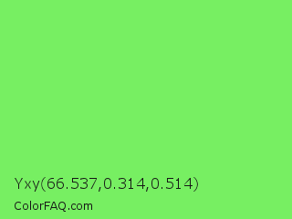 Yxy 66.537,0.314,0.514 Color is a light green color and the nearest color is Screamin Green #66ff66. Hex code #77ef62 and RGB value is rgb(119,239,98). In RGB color space, this color is composed of 47% red, 94% green, 38% blue, In CMYK color space, this color is composed of 50% cyan, 0% magenta, 59% yellow , 6% black , In HSL color space, this color has a hue angle of 111° , 82% saturation and 66% lightness.
