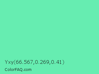 Yxy 66.567,0.269,0.41 Color is a light green color and the nearest color is Medium Aquamarine #66ddaa. Hex code #66edb1 and RGB value is rgb(102,237,177). In RGB color space, this color is composed of 40% red, 93% green, 69% blue, In CMYK color space, this color is composed of 57% cyan, 0% magenta, 25% yellow , 7% black , In HSL color space, this color has a hue angle of 153° , 79% saturation and 66% lightness.
