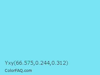 Yxy 66.575,0.244,0.312 Color is a light cyan color and the nearest color is Spray #79deec. Hex code #79e5f3 and RGB value is rgb(121,229,243). In RGB color space, this color is composed of 47% red, 90% green, 95% blue, In CMYK color space, this color is composed of 50% cyan, 6% magenta, 0% yellow , 5% black , In HSL color space, this color has a hue angle of 187° , 84% saturation and 71% lightness.