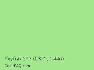 Yxy 66.593,0.321,0.446 Color is a light green color and the nearest color is Feijoa #9fdd8c. Hex code #a1e78b and RGB value is rgb(161,231,139). In RGB color space, this color is composed of 63% red, 91% green, 55% blue, In CMYK color space, this color is composed of 30% cyan, 0% magenta, 40% yellow , 9% black , In HSL color space, this color has a hue angle of 106° , 66% saturation and 73% lightness.