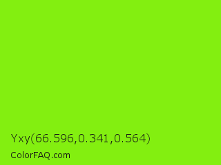 Yxy 66.596,0.341,0.564 Color is a normal green color and the nearest color is Lawn Green #7cfc00. Hex code #83ef10 and RGB value is rgb(131,239,16). In RGB color space, this color is composed of 51% red, 94% green, 6% blue, In CMYK color space, this color is composed of 45% cyan, 0% magenta, 93% yellow , 6% black , In HSL color space, this color has a hue angle of 89° , 87% saturation and 50% lightness.