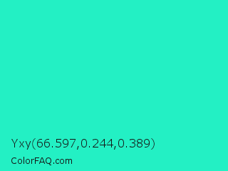Yxy 66.597,0.244,0.389 Color is a normal cyan color and the nearest color is Turquoise PWG #30d5c8. Hex code #23f0c4 and RGB value is rgb(35,240,196). In RGB color space, this color is composed of 14% red, 94% green, 77% blue, In CMYK color space, this color is composed of 85% cyan, 0% magenta, 18% yellow , 6% black , In HSL color space, this color has a hue angle of 167° , 87% saturation and 54% lightness.