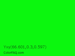 Yxy 66.601,0.3,0.597 Color is a normal green color and the nearest color is Green #00ff00. Hex code #0bf70e and RGB value is rgb(11,247,14). In RGB color space, this color is composed of 4% red, 97% green, 5% blue, In CMYK color space, this color is composed of 96% cyan, 0% magenta, 94% yellow , 3% black , In HSL color space, this color has a hue angle of 121° , 94% saturation and 51% lightness.