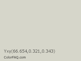 Yxy 66.654,0.321,0.343 Color is a very light yellow color and the nearest color is Timberwolf Crayola #d9d6cf. Hex code #d6d6ca and RGB value is rgb(214,214,202). In RGB color space, this color is composed of 84% red, 84% green, 79% blue, In CMYK color space, this color is composed of 0% cyan, 0% magenta, 6% yellow , 16% black , In HSL color space, this color has a hue angle of 60° , 13% saturation and 82% lightness.