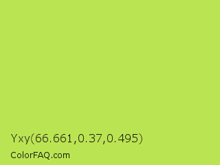 Yxy 66.661,0.37,0.495 Color is a light lime color and the nearest color is June Bud #bdda57. Hex code #bbe452 and RGB value is rgb(187,228,82). In RGB color space, this color is composed of 73% red, 89% green, 32% blue, In CMYK color space, this color is composed of 18% cyan, 0% magenta, 64% yellow , 11% black , In HSL color space, this color has a hue angle of 77° , 73% saturation and 61% lightness.