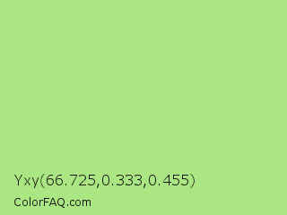 Yxy 66.725,0.333,0.455 Color is a light green color and the nearest color is Feijoa #9fdd8c. Hex code #aae681 and RGB value is rgb(170,230,129). In RGB color space, this color is composed of 67% red, 90% green, 51% blue, In CMYK color space, this color is composed of 26% cyan, 0% magenta, 44% yellow , 10% black , In HSL color space, this color has a hue angle of 96° , 67% saturation and 70% lightness.