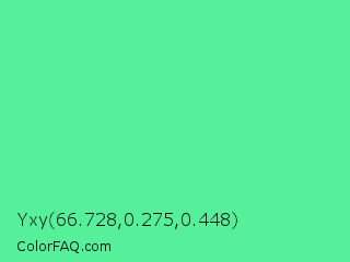 Yxy 66.728,0.275,0.448 Color is a light green color and the nearest color is Very Light Malachite Green #64e986. Hex code #57f09a and RGB value is rgb(87,240,154). In RGB color space, this color is composed of 34% red, 94% green, 60% blue, In CMYK color space, this color is composed of 64% cyan, 0% magenta, 36% yellow , 6% black , In HSL color space, this color has a hue angle of 146° , 84% saturation and 64% lightness.