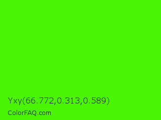 Yxy 66.772,0.313,0.589 Color is a normal green color and the nearest color is Chlorophyll Green #4aff00. Hex code #4af503 and RGB value is rgb(74,245,3). In RGB color space, this color is composed of 29% red, 96% green, 1% blue, In CMYK color space, this color is composed of 70% cyan, 0% magenta, 99% yellow , 4% black , In HSL color space, this color has a hue angle of 102° , 98% saturation and 49% lightness.