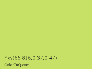 Yxy 66.816,0.37,0.47 Color is a light lime color and the nearest color is June Bud #bdda57. Hex code #c6e166 and RGB value is rgb(198,225,102). In RGB color space, this color is composed of 78% red, 88% green, 40% blue, In CMYK color space, this color is composed of 12% cyan, 0% magenta, 55% yellow , 12% black , In HSL color space, this color has a hue angle of 73° , 67% saturation and 64% lightness.