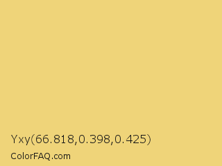Yxy 66.818,0.398,0.425 Color is a light yellow color and the nearest color is Golden Sand #f0db7d. Hex code #efd479 and RGB value is rgb(239,212,121). In RGB color space, this color is composed of 94% red, 83% green, 47% blue, In CMYK color space, this color is composed of 0% cyan, 11% magenta, 49% yellow , 6% black , In HSL color space, this color has a hue angle of 46° , 79% saturation and 71% lightness.