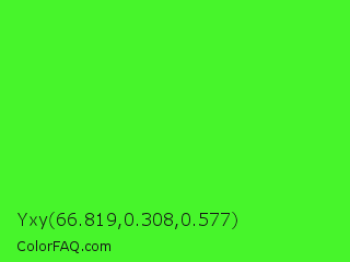 Yxy 66.819,0.308,0.577 Color is a normal green color and the nearest color is Neon Green #39ff14. Hex code #47f52b and RGB value is rgb(71,245,43). In RGB color space, this color is composed of 28% red, 96% green, 17% blue, In CMYK color space, this color is composed of 71% cyan, 0% magenta, 82% yellow , 4% black , In HSL color space, this color has a hue angle of 112° , 91% saturation and 56% lightness.