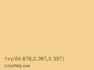 Yxy 66.878,0.387,0.397 Color is a light orange color and the nearest color is Chalky #eed794. Hex code #f4d191 and RGB value is rgb(244,209,145). In RGB color space, this color is composed of 96% red, 82% green, 57% blue, In CMYK color space, this color is composed of 0% cyan, 14% magenta, 41% yellow , 4% black , In HSL color space, this color has a hue angle of 39° , 82% saturation and 76% lightness.