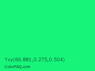 Yxy 66.881,0.275,0.504 Color is a normal green color and the nearest color is Spring Green #00ff7f. Hex code #16f57a and RGB value is rgb(22,245,122). In RGB color space, this color is composed of 9% red, 96% green, 48% blue, In CMYK color space, this color is composed of 91% cyan, 0% magenta, 50% yellow , 4% black , In HSL color space, this color has a hue angle of 147° , 92% saturation and 52% lightness.