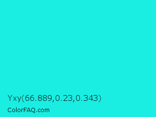 Yxy 66.889,0.23,0.343 Color is a normal cyan color and the nearest color is Bright Turquoise #08e8de. Hex code #1aeee3 and RGB value is rgb(26,238,227). In RGB color space, this color is composed of 10% red, 93% green, 89% blue, In CMYK color space, this color is composed of 89% cyan, 0% magenta, 5% yellow , 7% black , In HSL color space, this color has a hue angle of 177° , 86% saturation and 52% lightness.