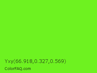 Yxy 66.918,0.327,0.569 Color is a normal green color and the nearest color is Spring Frost #87ff2a. Hex code #6ef220 and RGB value is rgb(110,242,32). In RGB color space, this color is composed of 43% red, 95% green, 13% blue, In CMYK color space, this color is composed of 55% cyan, 0% magenta, 87% yellow , 5% black , In HSL color space, this color has a hue angle of 98° , 89% saturation and 54% lightness.