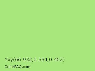 Yxy 66.932,0.334,0.462 Color is a light green color and the nearest color is Feijoa #9fdd8c. Hex code #a8e77c and RGB value is rgb(168,231,124). In RGB color space, this color is composed of 66% red, 91% green, 49% blue, In CMYK color space, this color is composed of 27% cyan, 0% magenta, 46% yellow , 9% black , In HSL color space, this color has a hue angle of 95° , 69% saturation and 70% lightness.
