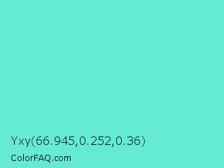 Yxy 66.945,0.252,0.36 Color is a light cyan color and the nearest color is Aquamarine Blue #71d9e2. Hex code #65ebd3 and RGB value is rgb(101,235,211). In RGB color space, this color is composed of 40% red, 92% green, 83% blue, In CMYK color space, this color is composed of 57% cyan, 0% magenta, 10% yellow , 8% black , In HSL color space, this color has a hue angle of 169° , 77% saturation and 66% lightness.
