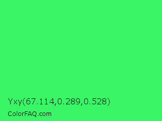 Yxy 67.114,0.289,0.528 Color is a normal green color and the nearest color is UFO Green #3cd070. Hex code #3af565 and RGB value is rgb(58,245,101). In RGB color space, this color is composed of 23% red, 96% green, 40% blue, In CMYK color space, this color is composed of 76% cyan, 0% magenta, 59% yellow , 4% black , In HSL color space, this color has a hue angle of 134° , 90% saturation and 59% lightness.