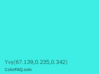 Yxy 67.139,0.235,0.342 Color is a normal cyan color and the nearest color is Turquoise #40e0d0. Hex code #3eede3 and RGB value is rgb(62,237,227). In RGB color space, this color is composed of 24% red, 93% green, 89% blue, In CMYK color space, this color is composed of 74% cyan, 0% magenta, 4% yellow , 7% black , In HSL color space, this color has a hue angle of 177° , 83% saturation and 59% lightness.