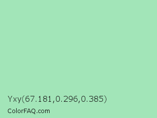 Yxy 67.181,0.296,0.385 Color is a light green color and the nearest color is Chinook #a8e3bd. Hex code #a2e5b8 and RGB value is rgb(162,229,184). In RGB color space, this color is composed of 64% red, 90% green, 72% blue, In CMYK color space, this color is composed of 29% cyan, 0% magenta, 20% yellow , 10% black , In HSL color space, this color has a hue angle of 140° , 56% saturation and 77% lightness.
