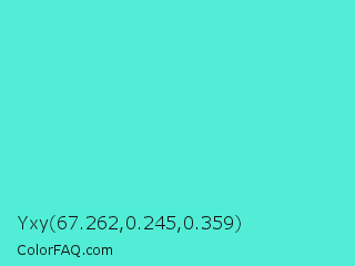 Yxy 67.262,0.245,0.359 Color is a light cyan color and the nearest color is Turquoise #40e0d0. Hex code #52edd6 and RGB value is rgb(82,237,214). In RGB color space, this color is composed of 32% red, 93% green, 84% blue, In CMYK color space, this color is composed of 65% cyan, 0% magenta, 10% yellow , 7% black , In HSL color space, this color has a hue angle of 171° , 81% saturation and 63% lightness.