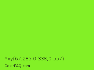 Yxy 67.285,0.338,0.557 Color is a normal green color and the nearest color is Spring Frost #87ff2a. Hex code #83f026 and RGB value is rgb(131,240,38). In RGB color space, this color is composed of 51% red, 94% green, 15% blue, In CMYK color space, this color is composed of 45% cyan, 0% magenta, 84% yellow , 6% black , In HSL color space, this color has a hue angle of 92° , 87% saturation and 55% lightness.