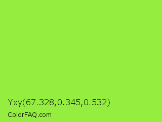 Yxy 67.328,0.345,0.532 Color is a normal green color and the nearest color is Kiwi #8ee53f. Hex code #95ed40 and RGB value is rgb(149,237,64). In RGB color space, this color is composed of 58% red, 93% green, 25% blue, In CMYK color space, this color is composed of 37% cyan, 0% magenta, 73% yellow , 7% black , In HSL color space, this color has a hue angle of 91° , 83% saturation and 59% lightness.