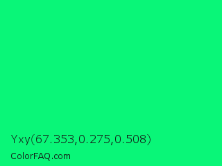 Yxy 67.353,0.275,0.508 Color is a normal green color and the nearest color is Spring Green #00ff7f. Hex code #09f678 and RGB value is rgb(9,246,120). In RGB color space, this color is composed of 4% red, 96% green, 47% blue, In CMYK color space, this color is composed of 96% cyan, 0% magenta, 51% yellow , 4% black , In HSL color space, this color has a hue angle of 148° , 93% saturation and 50% lightness.