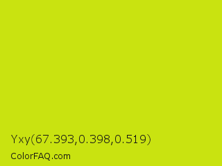 Yxy 67.393,0.398,0.519 Color is a normal yellow color and the nearest color is Las Palmas #c6e610. Hex code #c9e310 and RGB value is rgb(201,227,16). In RGB color space, this color is composed of 79% red, 89% green, 6% blue, In CMYK color space, this color is composed of 11% cyan, 0% magenta, 93% yellow , 11% black , In HSL color space, this color has a hue angle of 67° , 87% saturation and 48% lightness.