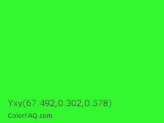 Yxy 67.492,0.302,0.578 Color is a normal green color and the nearest color is Neon Green #39ff14. Hex code #35f730 and RGB value is rgb(53,247,48). In RGB color space, this color is composed of 21% red, 97% green, 19% blue, In CMYK color space, this color is composed of 79% cyan, 0% magenta, 81% yellow , 3% black , In HSL color space, this color has a hue angle of 118° , 93% saturation and 58% lightness.