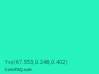Yxy 67.553,0.248,0.402 Color is a normal cyan color and the nearest color is Turquoise PWG #30d5c8. Hex code #25f2bd and RGB value is rgb(37,242,189). In RGB color space, this color is composed of 15% red, 95% green, 74% blue, In CMYK color space, this color is composed of 85% cyan, 0% magenta, 22% yellow , 5% black , In HSL color space, this color has a hue angle of 164° , 89% saturation and 55% lightness.