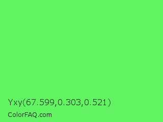Yxy 67.599,0.303,0.521 Color is a light green color and the nearest color is Screamin Green #66ff66. Hex code #62f363 and RGB value is rgb(98,243,99). In RGB color space, this color is composed of 38% red, 95% green, 39% blue, In CMYK color space, this color is composed of 60% cyan, 0% magenta, 59% yellow , 5% black , In HSL color space, this color has a hue angle of 120° , 86% saturation and 67% lightness.