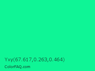 Yxy 67.617,0.263,0.464 Color is a normal green color and the nearest color is Medium Spring Green #00fa9a. Hex code #0ef596 and RGB value is rgb(14,245,150). In RGB color space, this color is composed of 5% red, 96% green, 59% blue, In CMYK color space, this color is composed of 94% cyan, 0% magenta, 39% yellow , 4% black , In HSL color space, this color has a hue angle of 155° , 92% saturation and 51% lightness.