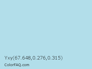 Yxy 67.648,0.276,0.315 Color is a very light cyan color and the nearest color is Powder Blue #b0e0e6. Hex code #b2deea and RGB value is rgb(178,222,234). In RGB color space, this color is composed of 70% red, 87% green, 92% blue, In CMYK color space, this color is composed of 24% cyan, 5% magenta, 0% yellow , 8% black , In HSL color space, this color has a hue angle of 193° , 57% saturation and 81% lightness.