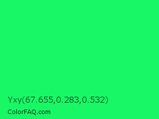 Yxy 67.655,0.283,0.532 Color is a normal green color and the nearest color is Spring Green #00ff7f. Hex code #18f765 and RGB value is rgb(24,247,101). In RGB color space, this color is composed of 9% red, 97% green, 40% blue, In CMYK color space, this color is composed of 90% cyan, 0% magenta, 59% yellow , 3% black , In HSL color space, this color has a hue angle of 141° , 93% saturation and 53% lightness.